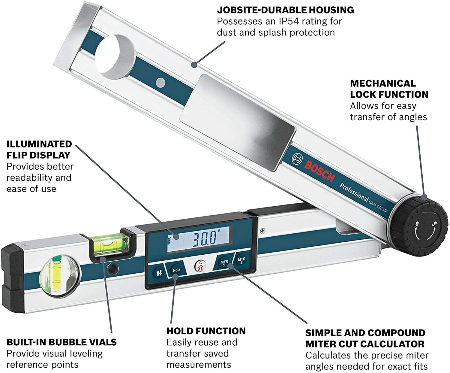 The Bosch GAM 220 MF Digital Angle Finder is four tools in one: an angle finder, a cut calculator, a protractor and a level. The flip display is illuminated and rotating, making it easy to read. The simple miter cut calculation has an input range of 0-220 degrees, and it includes a compound cut calculator. It has clearly labeled buttons for straightforward calculations. This angle finder provides angle memory, to provide the same angle measurement in different areas of the jobsite. The tool has robust housing with IP 54 protection. It’s a perfect tool for carpenters, remodelers and contractors.