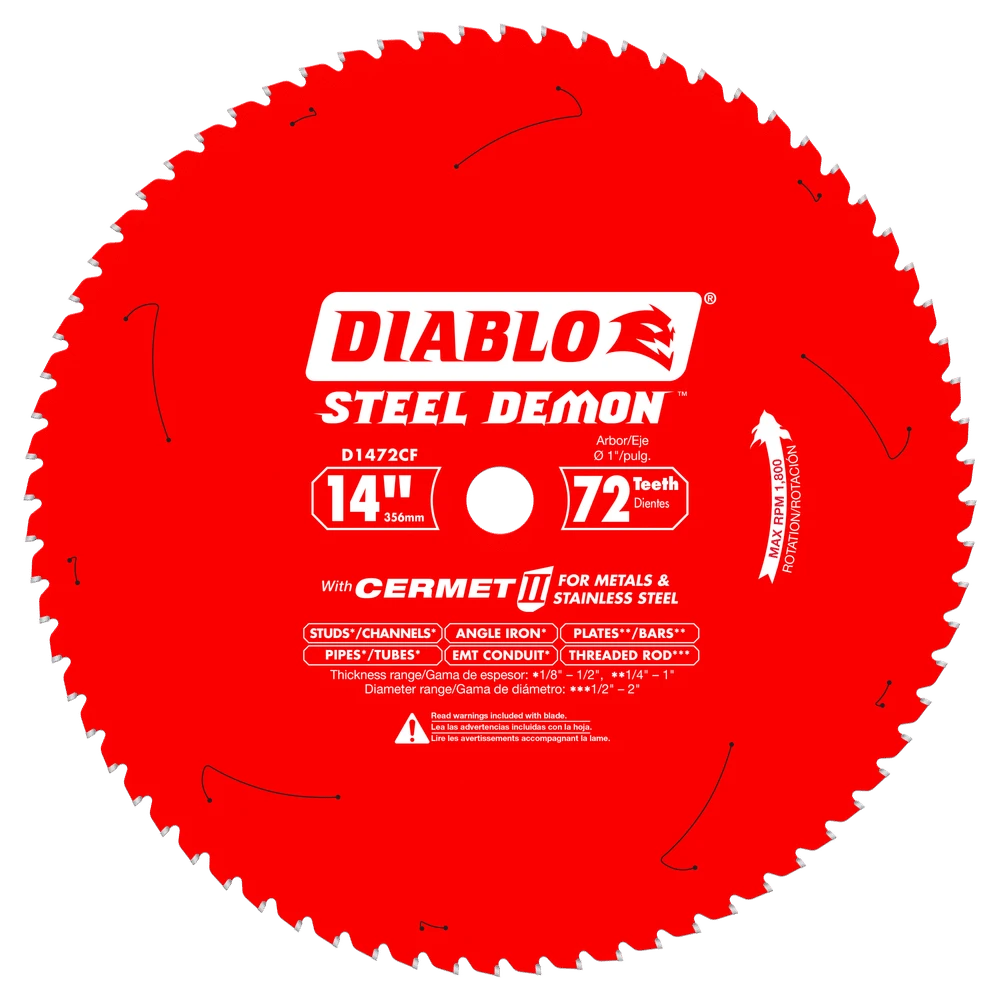 DiabloÕs Steel Demon Cermet II saw blades are redefining metal cutting, and the jobsite, by introducing exclusive innovation for cutting metals and stainless steels with a cordless or corded circular saw. The specially formulated Cermet II teeth provide high heat tolerance and increased hardness for superior wear and life delivering up to 25X longer life, 50X cooler cuts and 10X faster cuts when compared to standard grinding discs. Featuring a special Triple Chip Grind and Perma-SHIELD¨ coating, these blades slice through the toughest of metals to produce precise, burr-free cuts with less sparks. A controlled cutting action produces larger chip sizes that generates less dust and airborne contaminates. The ability to cut through both metals and stainless steels eliminates the need for individually dedicated saw blades, offering a one-blade solution for the ultimate metal cutting performance and an unmatched value.