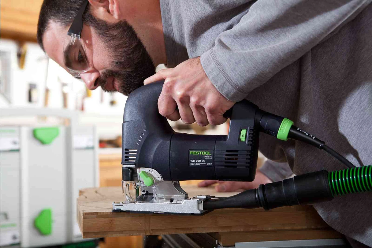 The secret to splinter-free cuts is full material support at the cutting point. Trion jigsaw splinter guards are designed to be cut by the blade for perfect zero-clearance between the blade and the splinterguard. The resultant cut is clean through the entire piece with little or no finishing required. The D-handle PSB 300 features a finger tip trigger and smaller profile grip. The PSB 300 has all the qualities of the PS 300, with the addition of a comfortable D-handle for easy one-handed use.