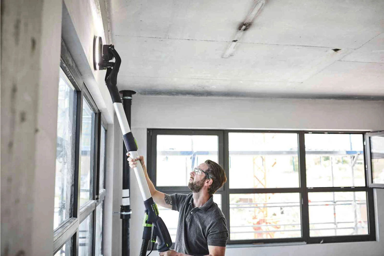 Festool guide extension for use with the Planex LHS 2 223 EQ(I). Quickly attached or remove from the PLANEX with an easy tool-free latching mechanism. Easily reach high ceilings and the tops of walls.