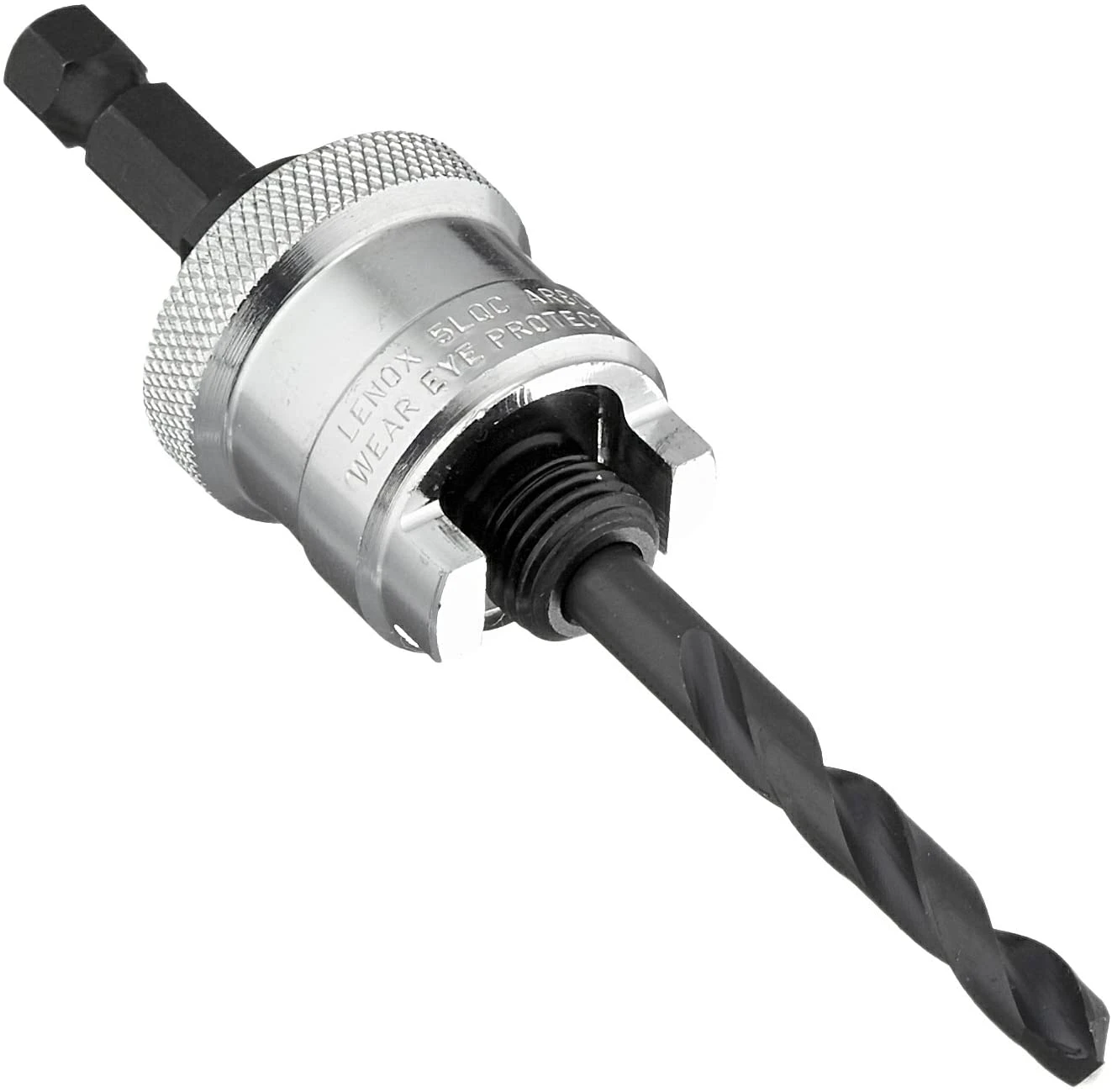 The Lenox Tools 5L Snap-Back Arbor with 3-1/4″ Pilot Drill Bit is a durable, long lasting mandrel that works with most hole saws 9/16″ to- 1-3/16″. The Snap-Back design lets you to pull back the drive pins to thread the hole saw. Releasing the drive pins back into place then allows the hole saw to turn on the pins and not the threading and makes disengaging the hole saw fast and easy. Manufactured of hardened carbon steel, the arbor features a split point pilot tip for faster penetration and less walking than standard arbors. The arbor also allows for you to replace the pilot bits through the use of a hex key and a set screw.