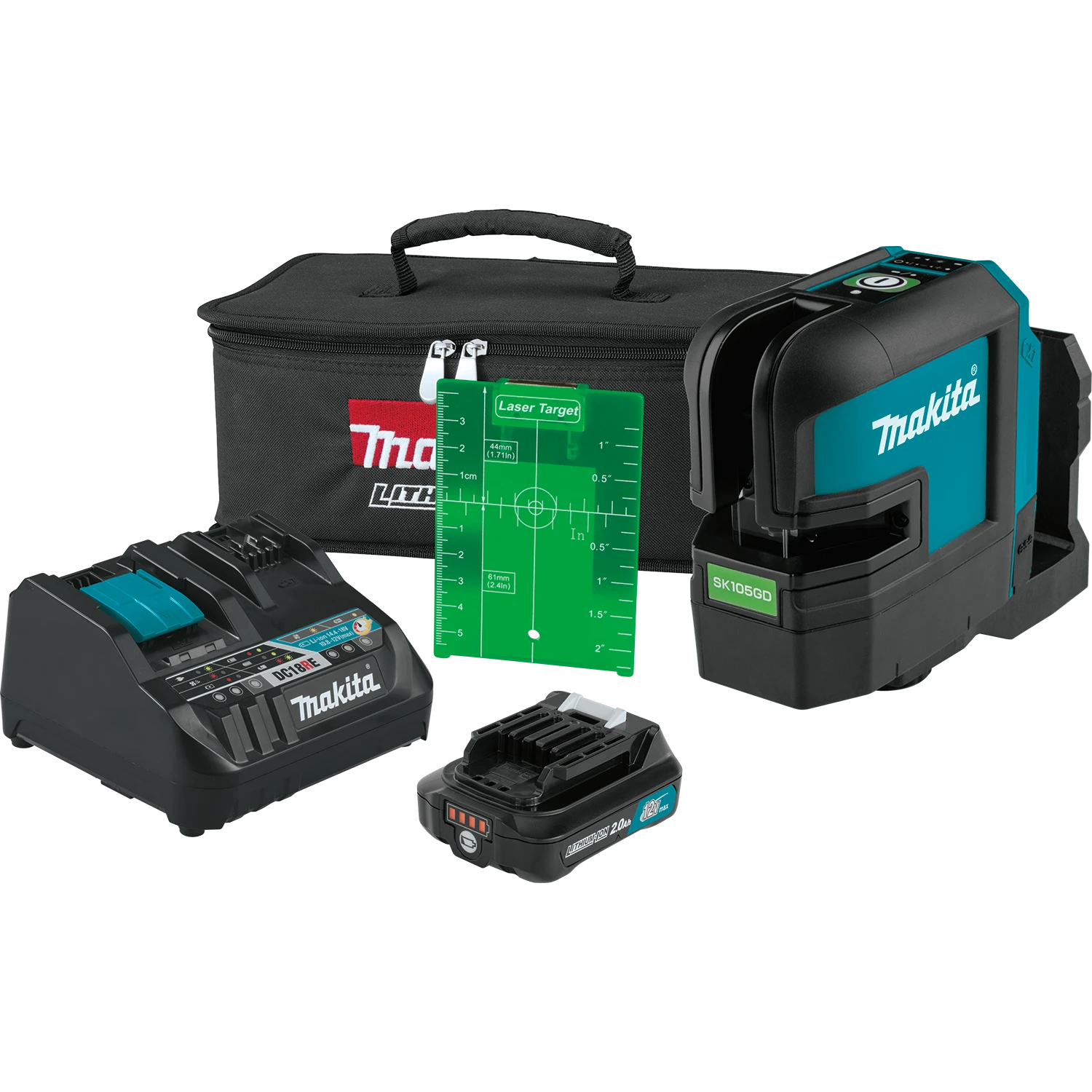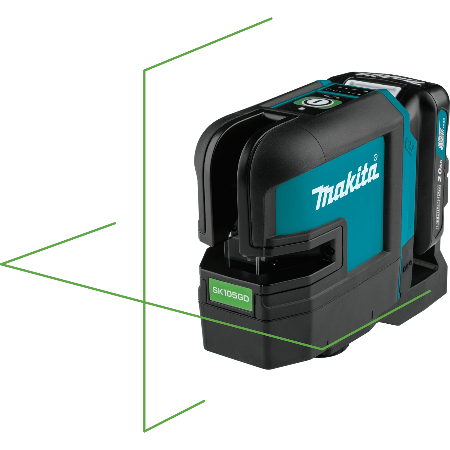 Lasers are typically utilized in the early stages of construction, and measurement needs will vary based on application requirements. The Makita 12V Max CXT Lithium-Ion Self-Leveling Cross-Line Green Beam Laser (SK105GDNAX) gives the user a cordless solution for selectable horizontal/vertical cross reference lines required for level, align, and plumb applications. Depending on ambient light in the working environment, the SK105GDNAX has a line visibility range up to 115′ and is detectable up to 262′ with a Makita Laser Detector (sold separately).